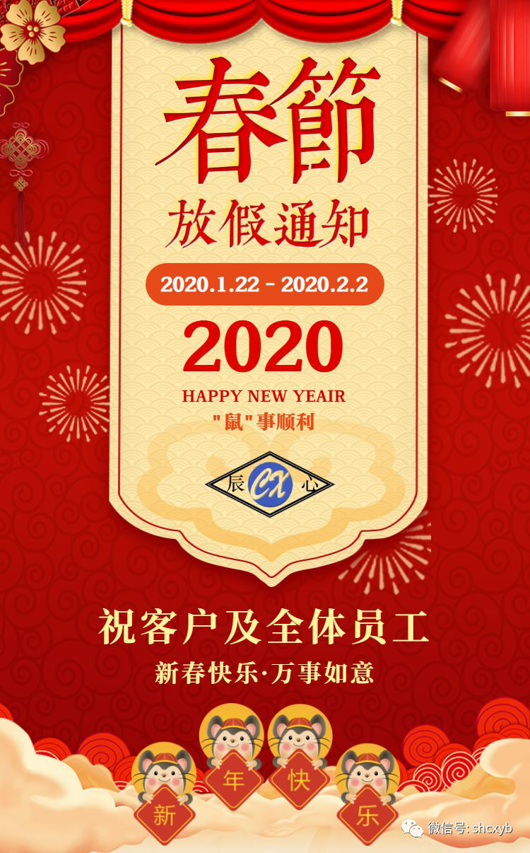自2020年1月22日至2020年2月2日為我公司春節放假期,屆時將停止發貨(huò), 所有訂單都將(jiāng)在春節假期(qī)回來的第一天(2月3日)按訂單順序陸續發出給 您帶來的不便,敬請諒解!